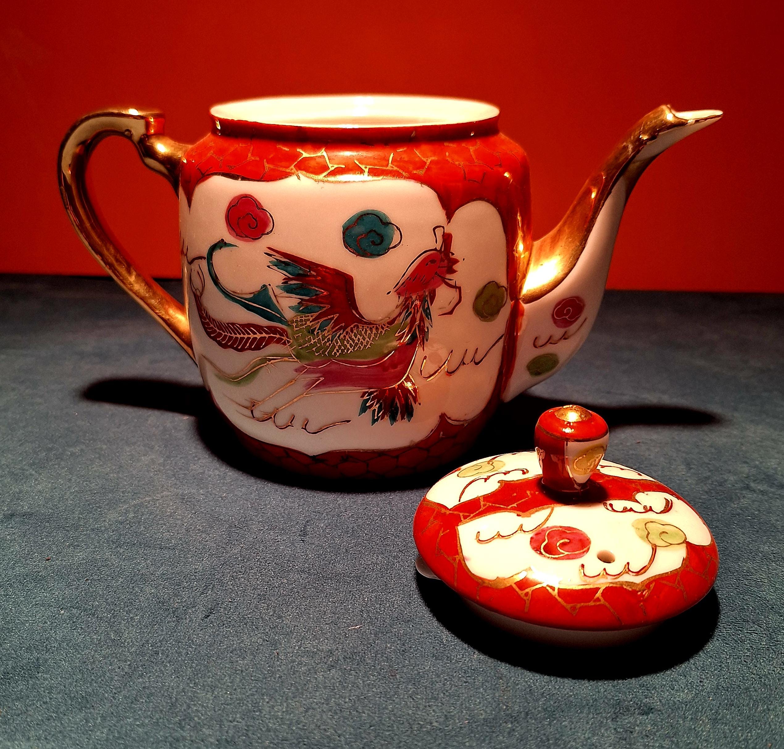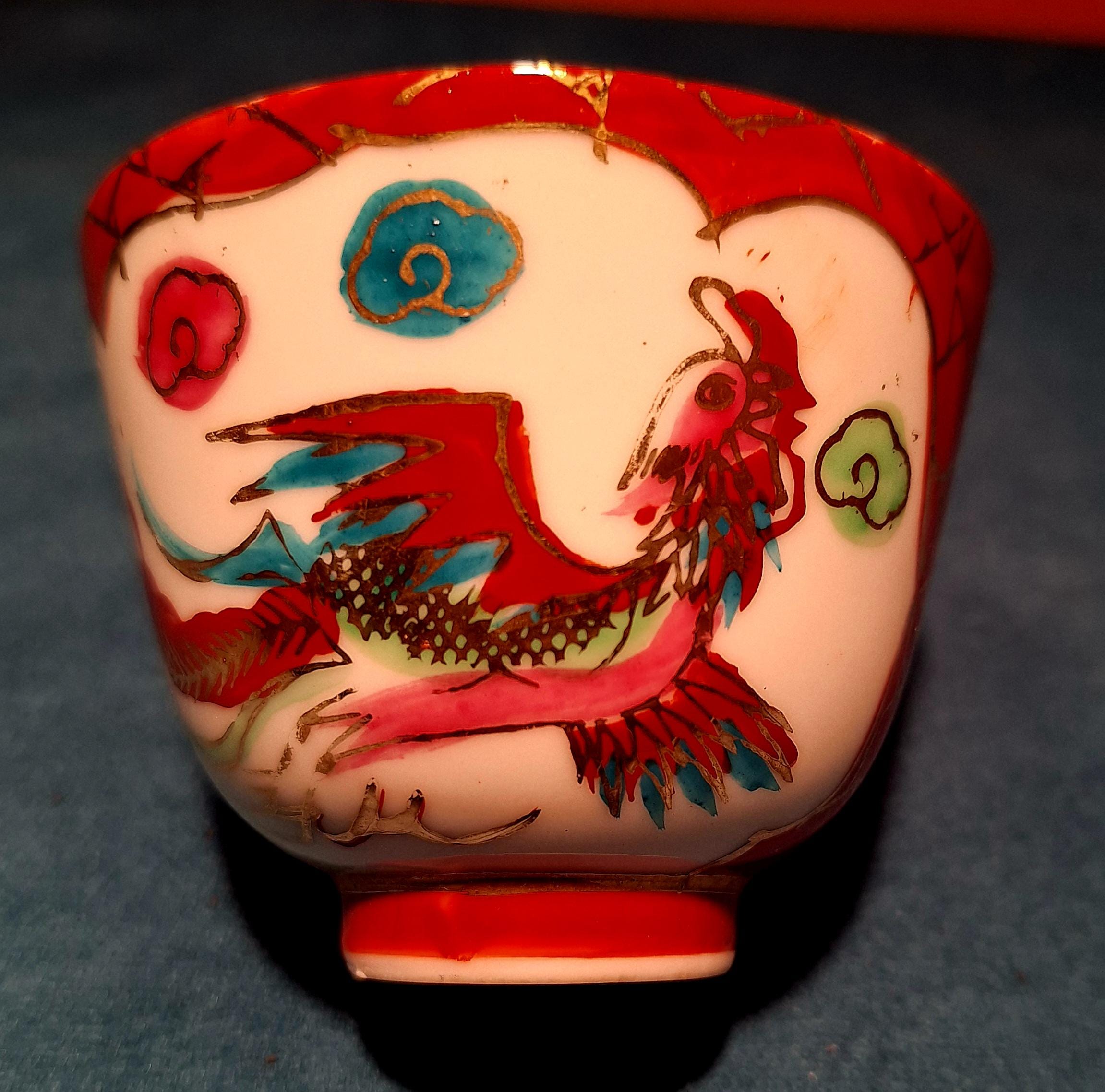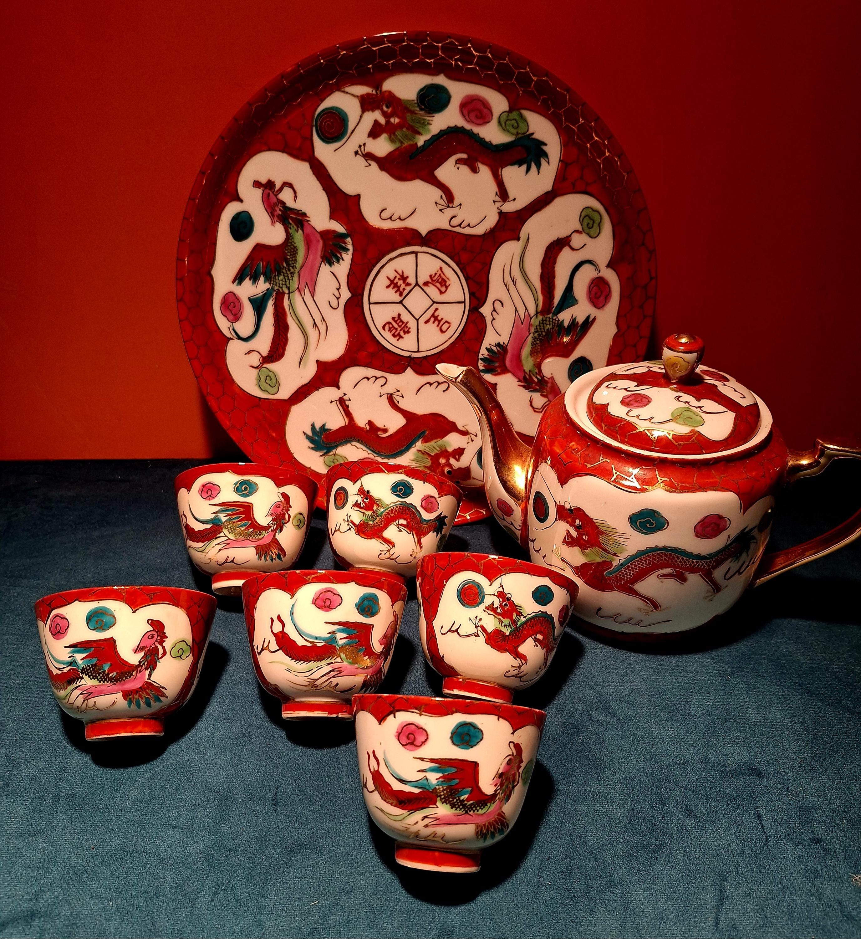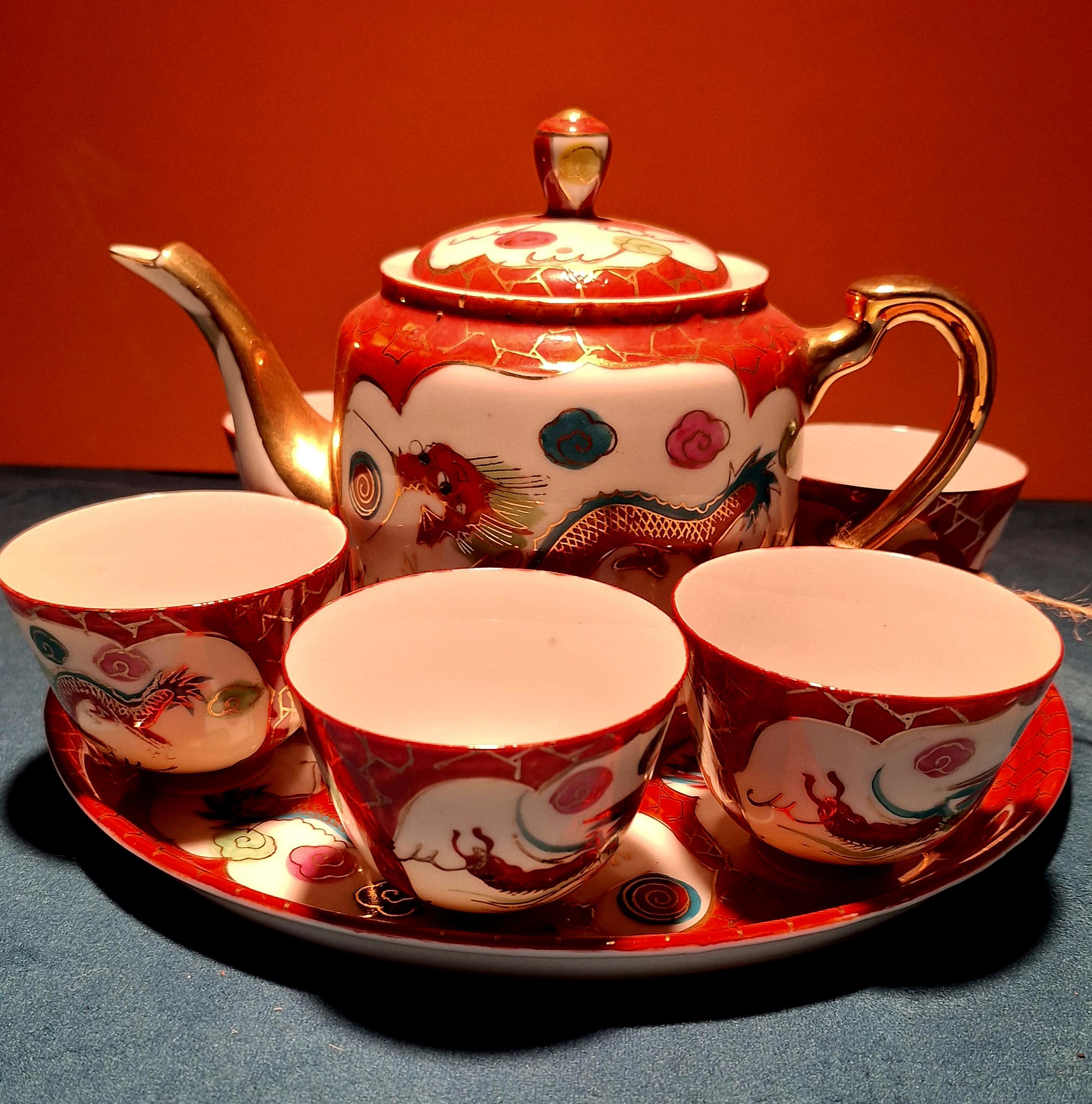 1940 Chinese porcelain tea set with Red dragon and Phoenix with 22 karat gold.