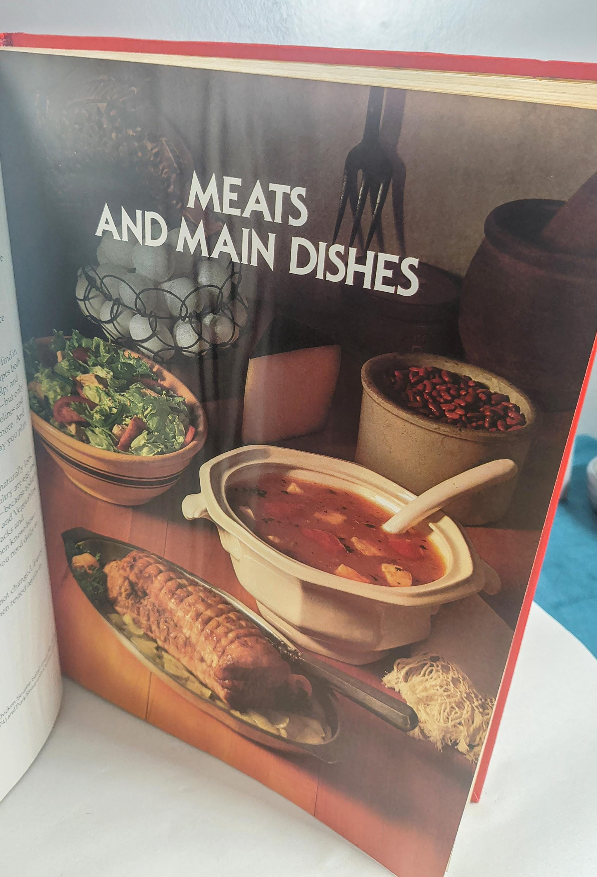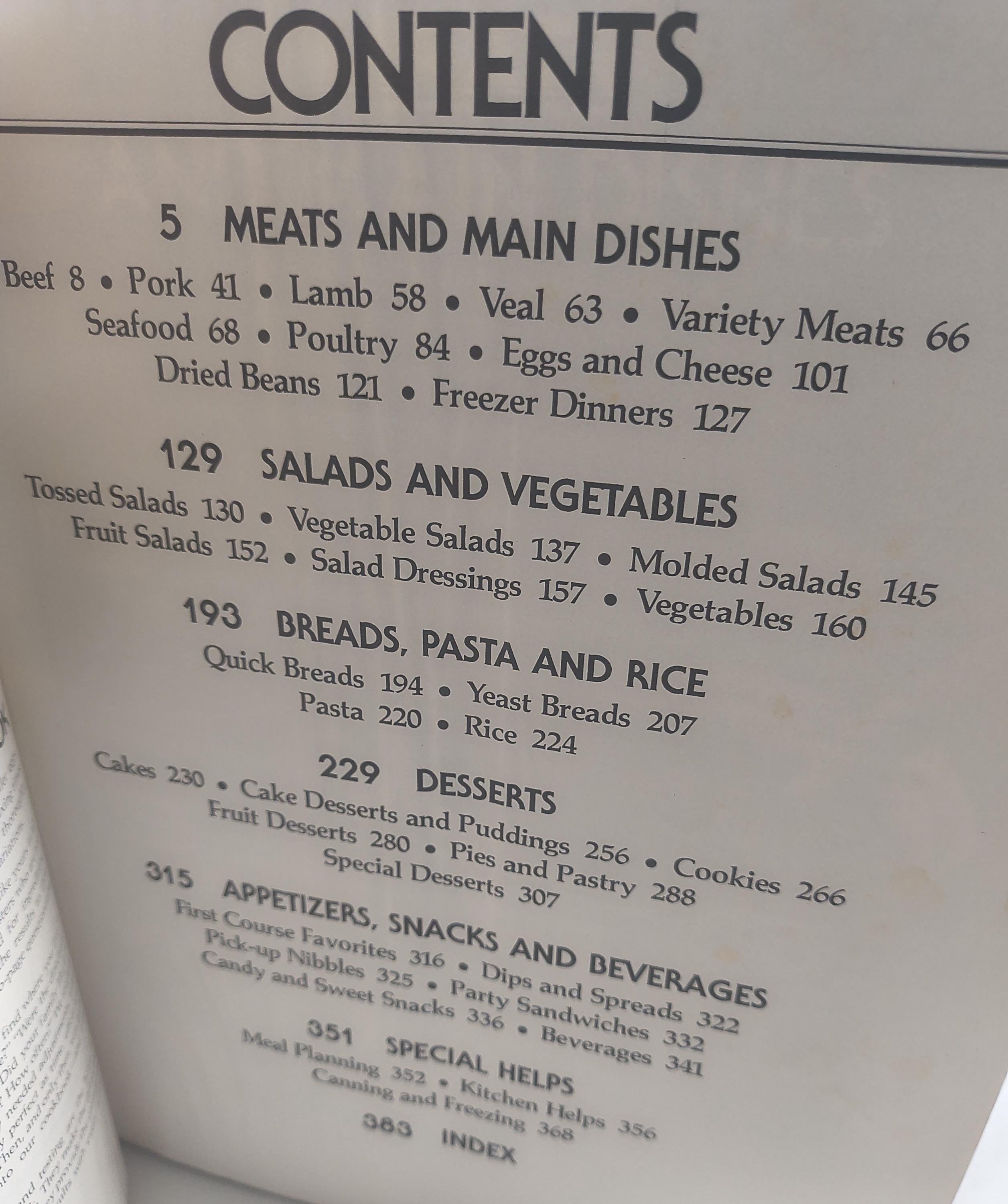 It's organized for ease of use, often with sections like meats and main dishes first, and includes various cooking hints, shopping tips, and charts.