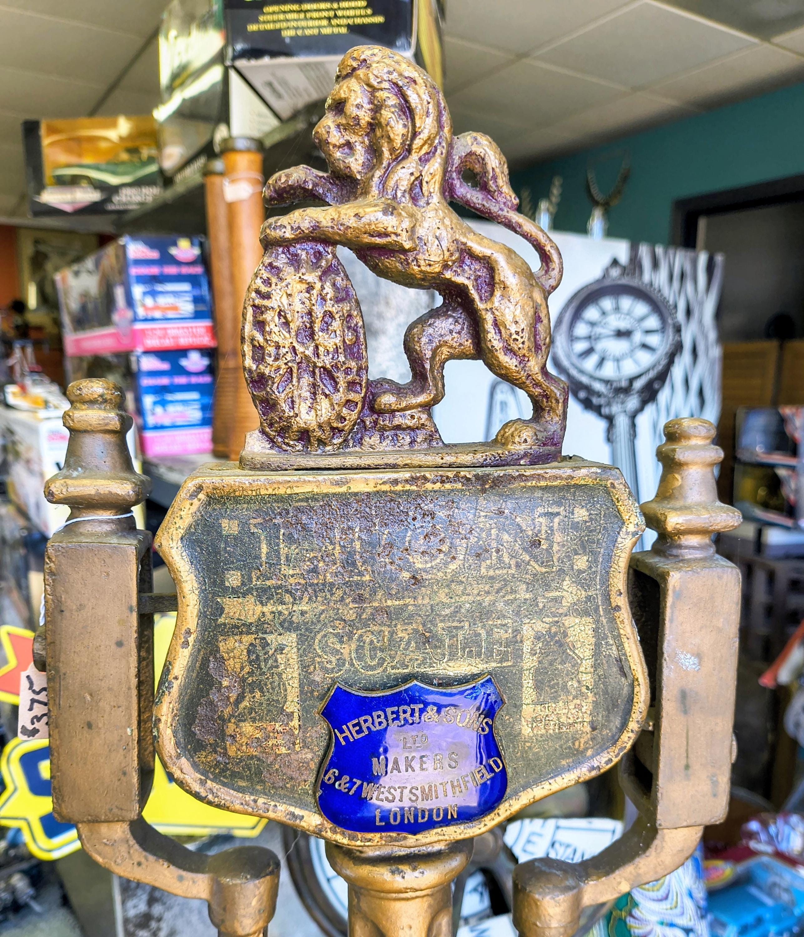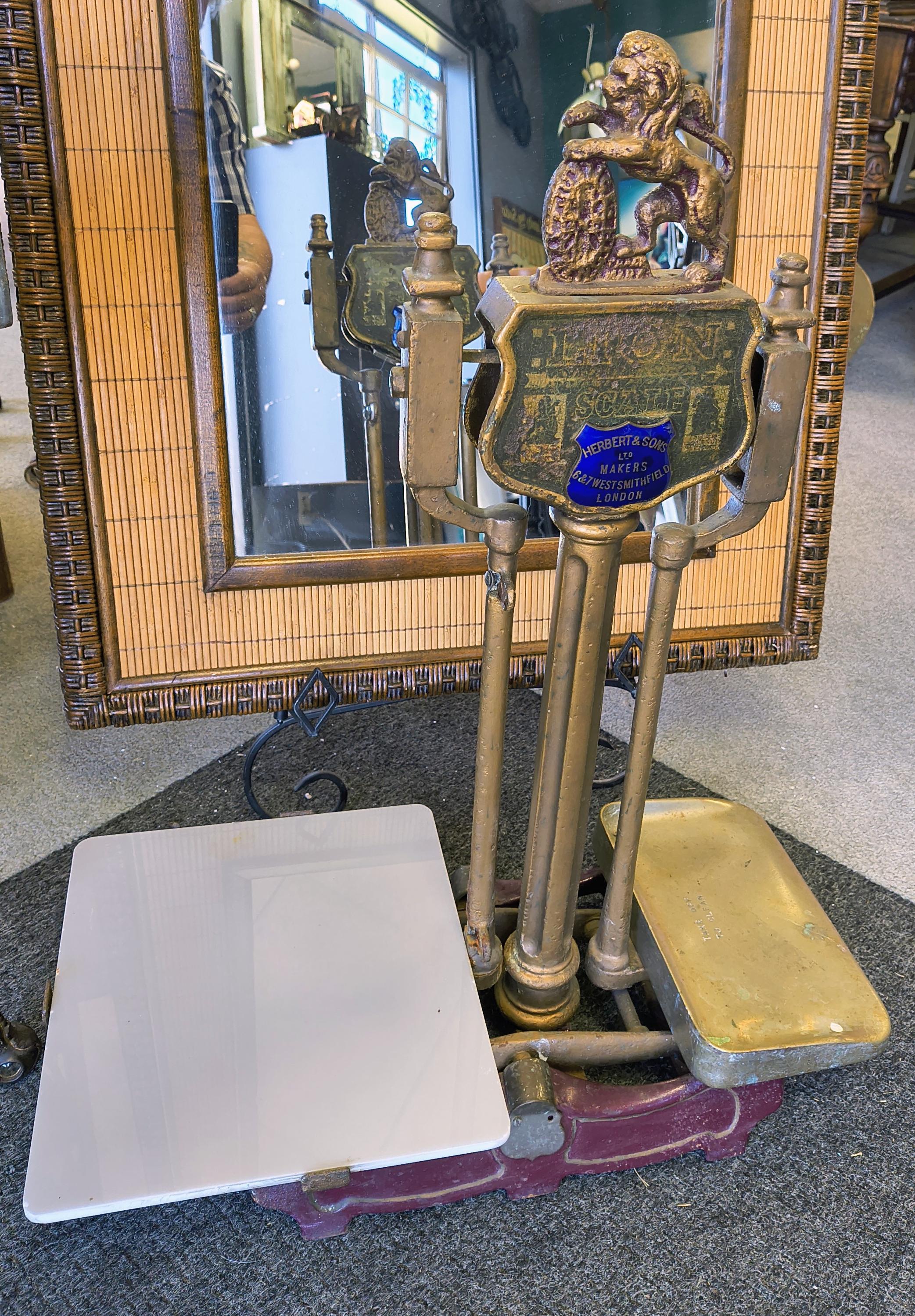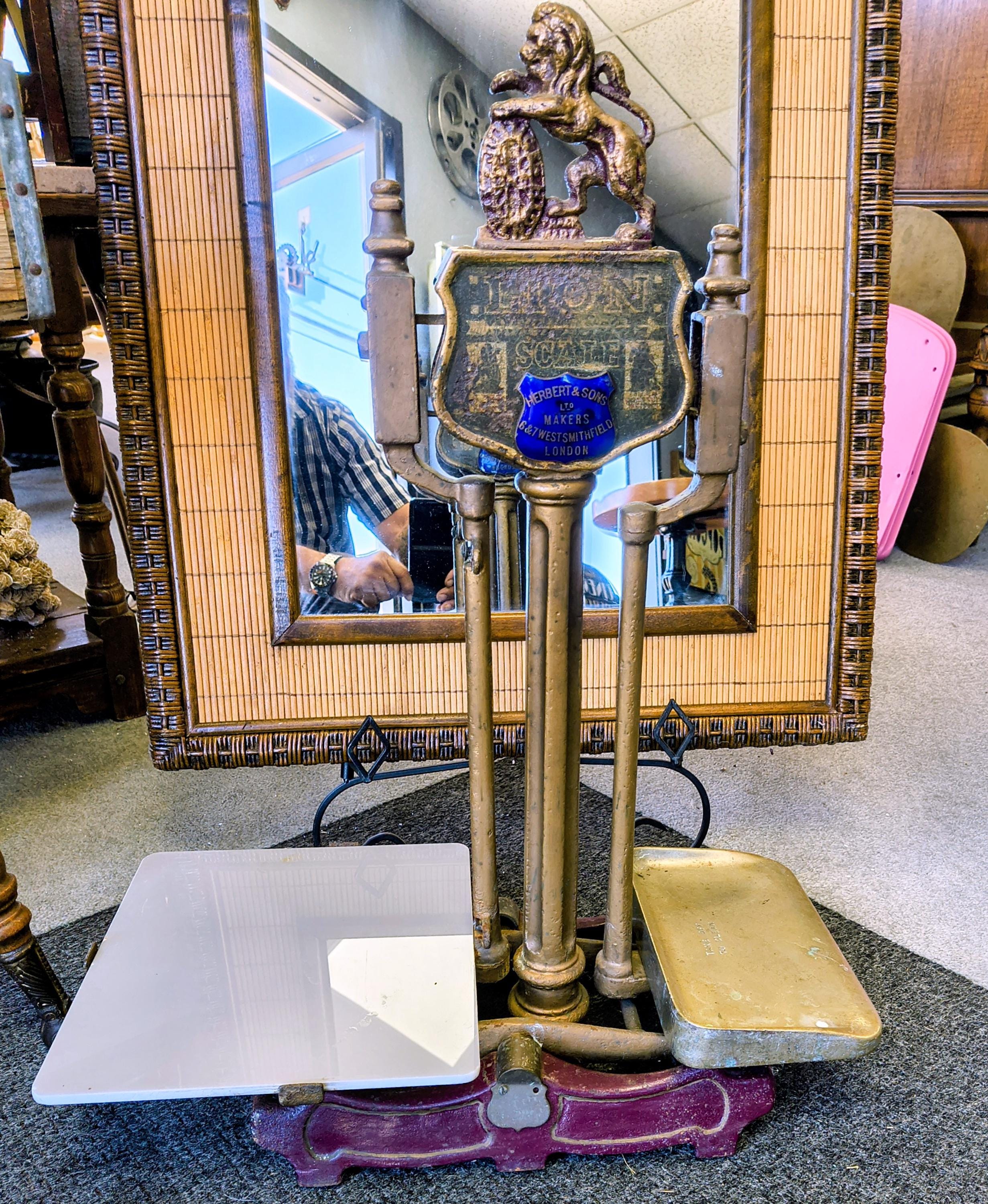 The image displays an antique Herbert & Sons "Lion Quick Action Scale", an English commercial balance scale known for its distinctive lion cresting and often used in shops and for weighing produce.