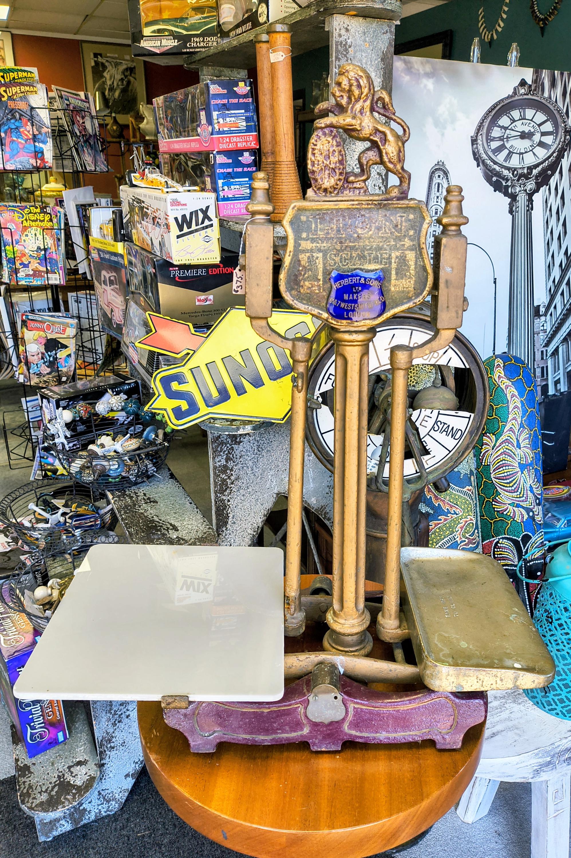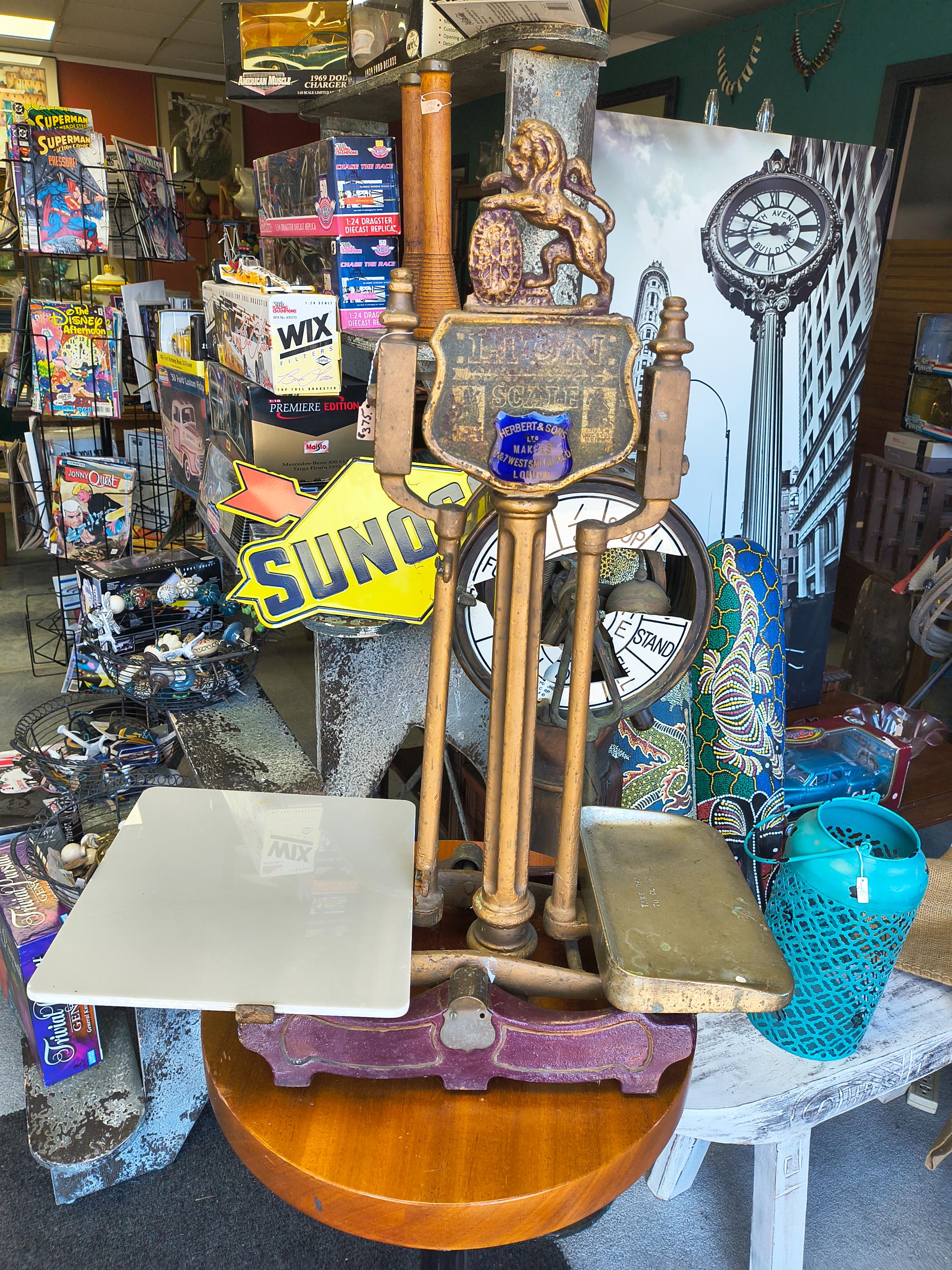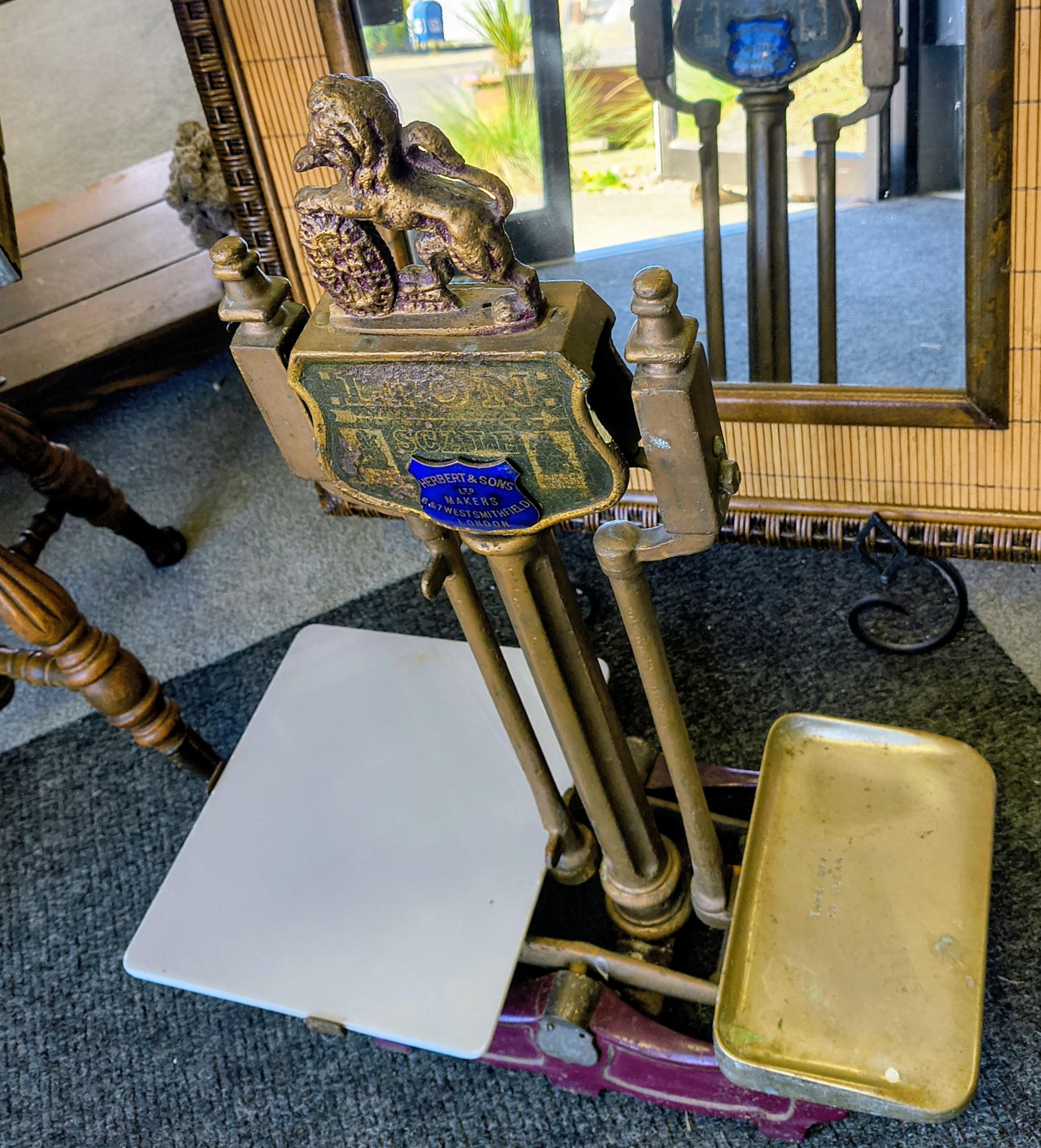 The image displays an antique Herbert & Sons "Lion Quick Action Scale", an English commercial balance scale known for its distinctive lion cresting and often used in shops and for weighing produce.
