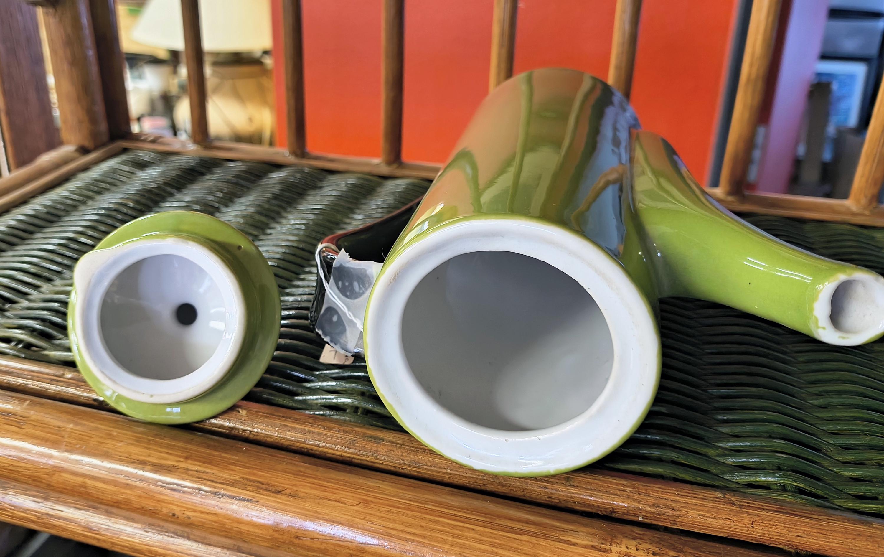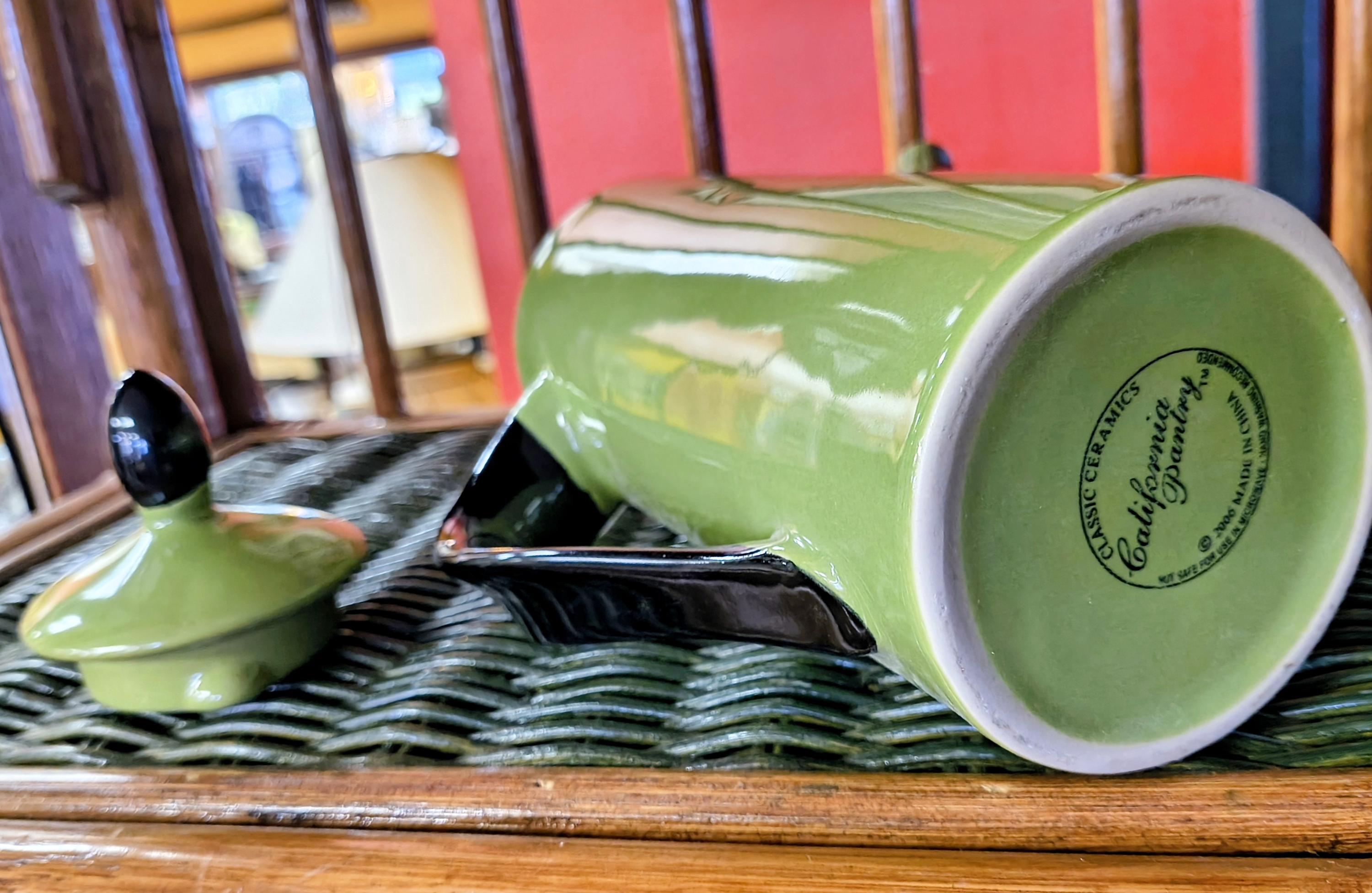 Gorgeous, rare art deco design slim avocado tea/ coffee pot. Ceramic porcelain by California Pantry