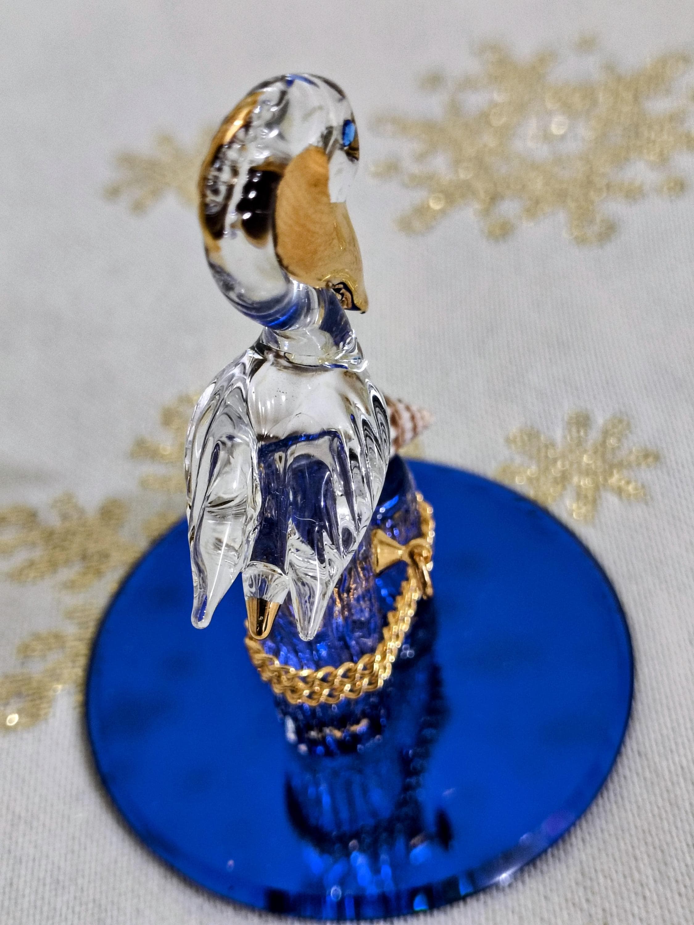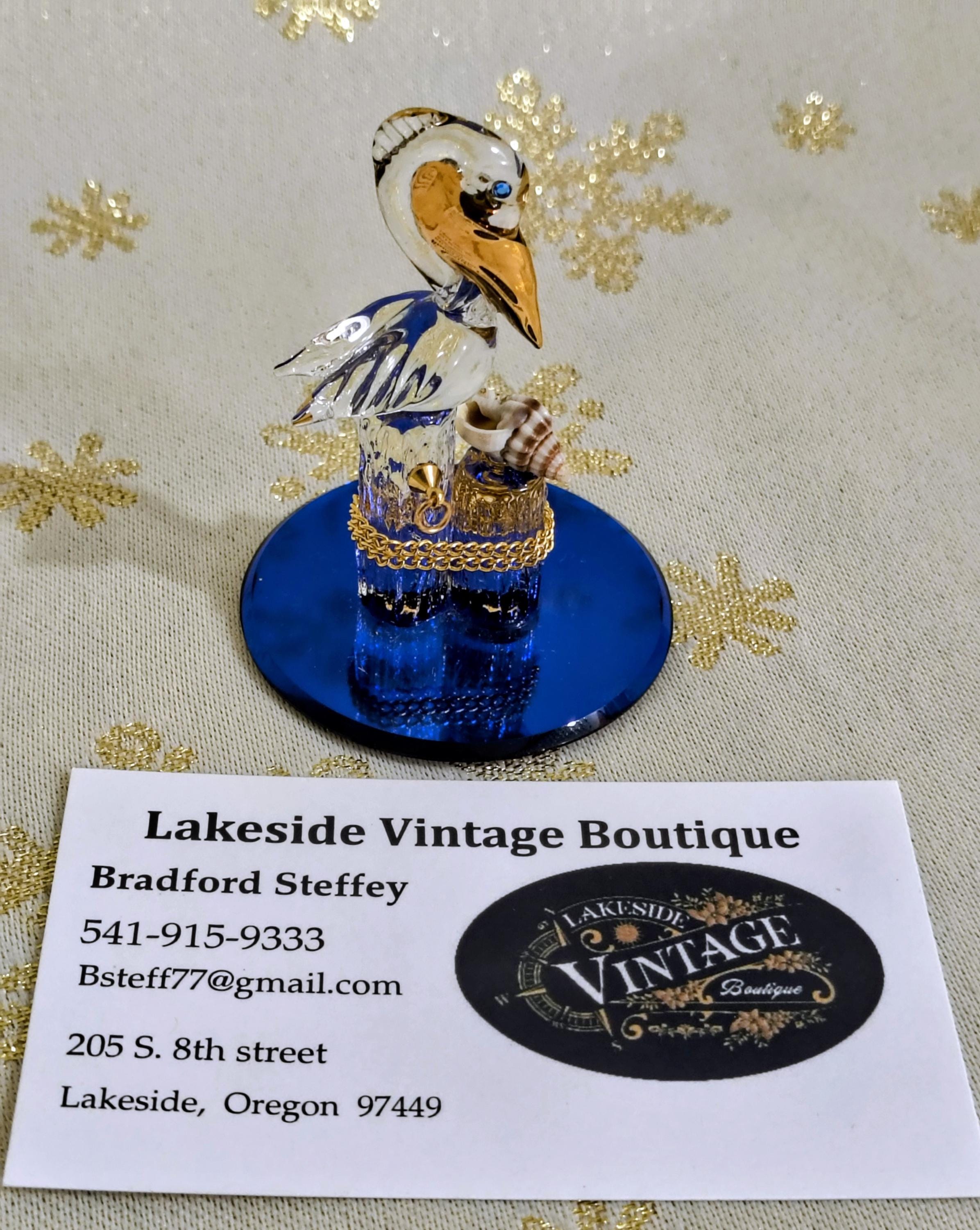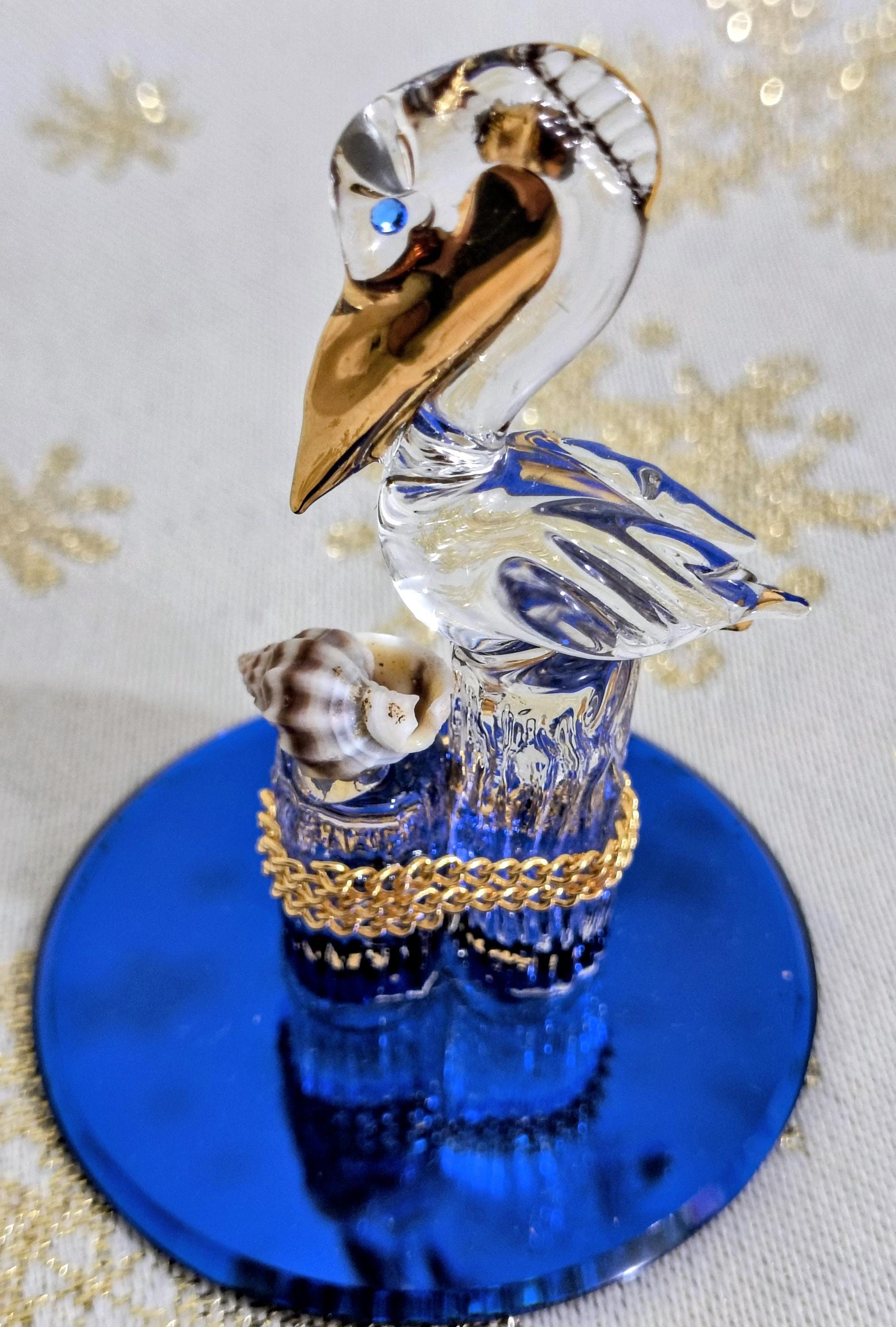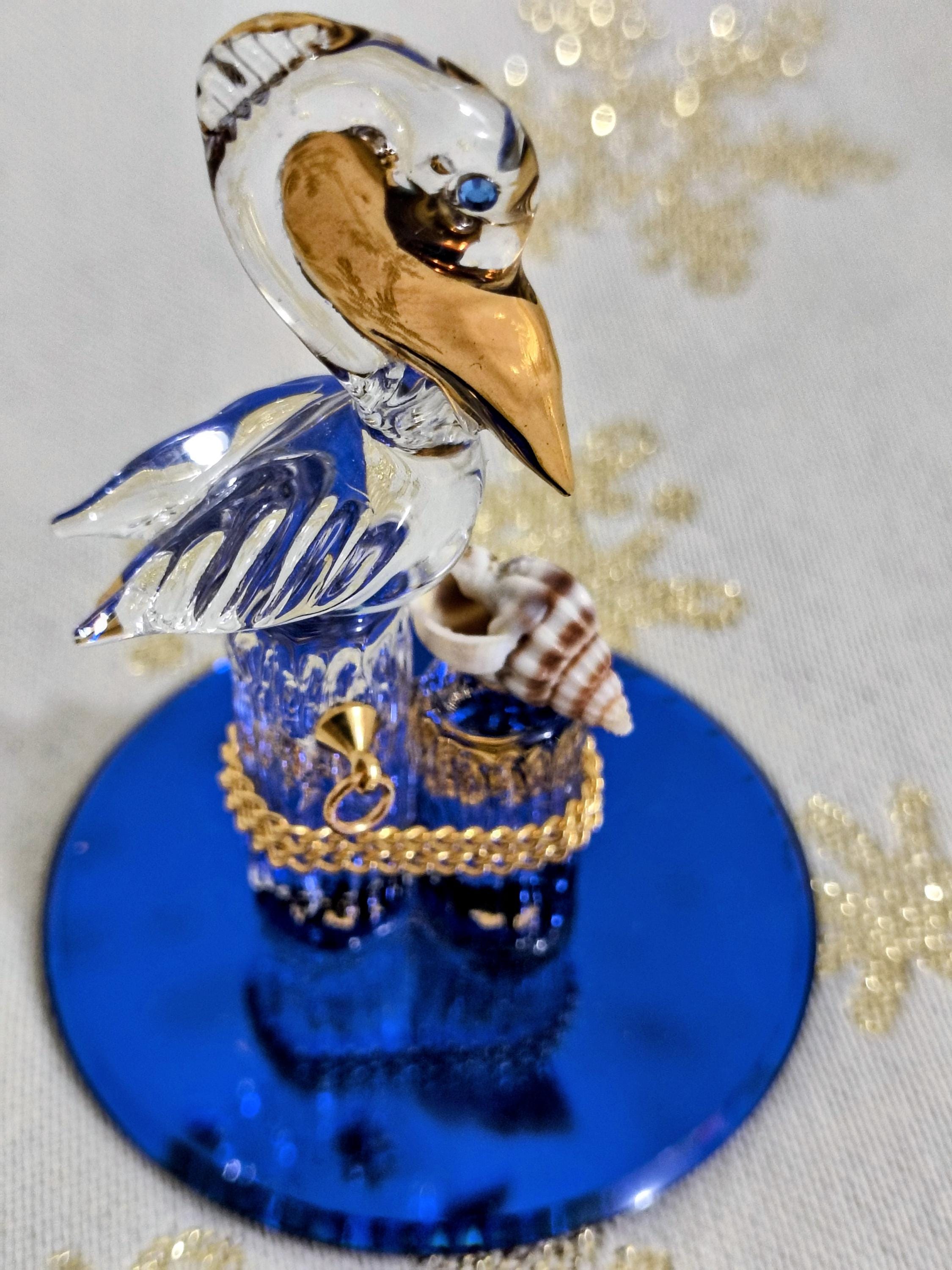 Item is a genuine Glass Baron blown glass Pelican figurine with Sworovski crystal eyes and genuine 22k gold accents with a genuine seashell attachment. It sets atop a cobalt blue beveled glass mirrored base for a superb , intricate, gorgeous figure.
