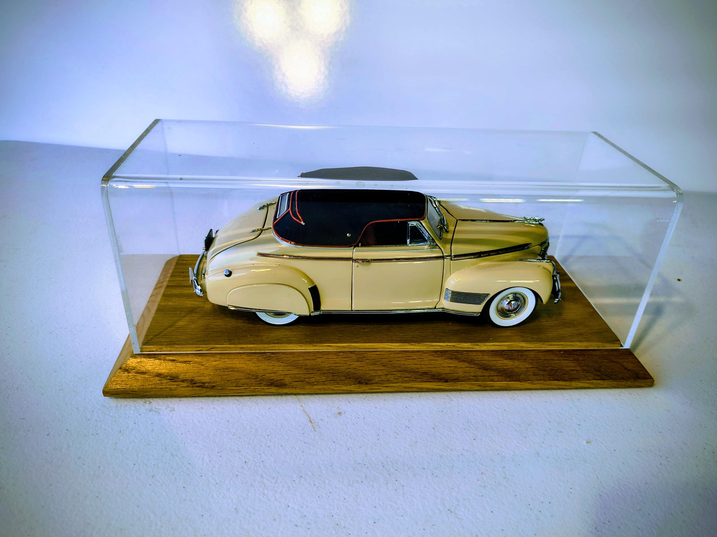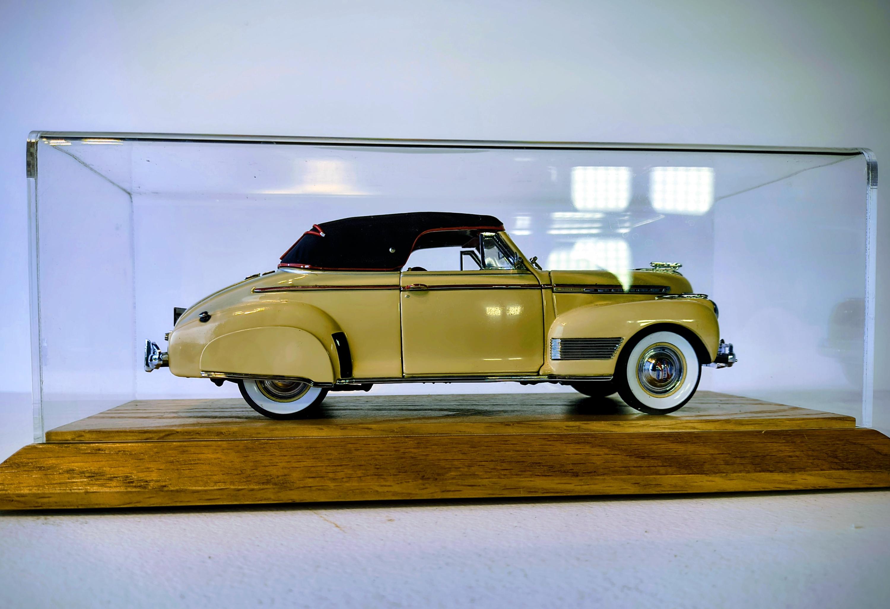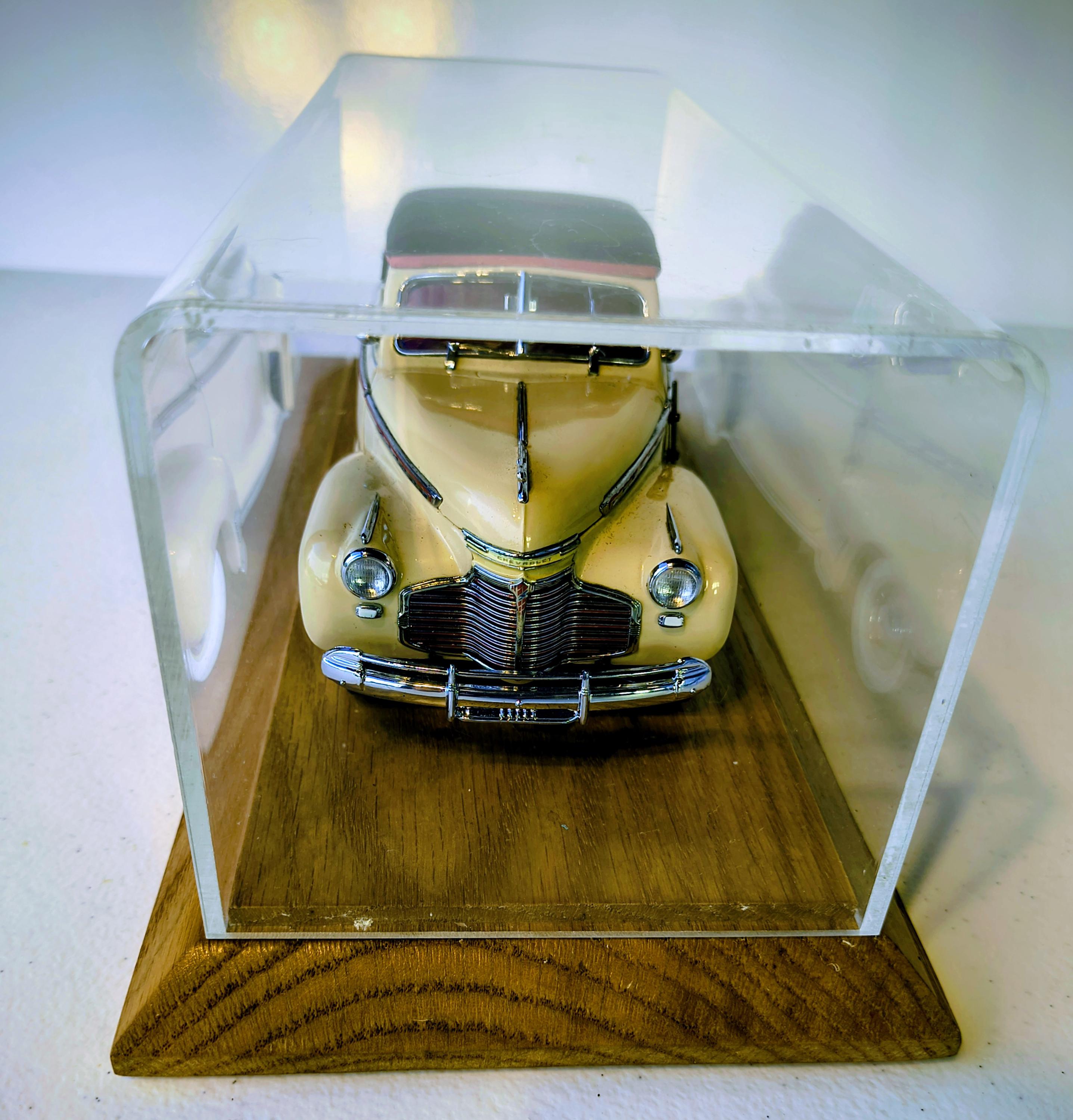 Danbury Mint 1941 Chevrolet Special Deluxe is a highly detailed 1:24 scale diecast model replica of the classic pre-WWII American automobile, produced by the renowned Danbury Mint. Additional solid oak base with clear acrylic cover custom made to showcase this magnificent creation.