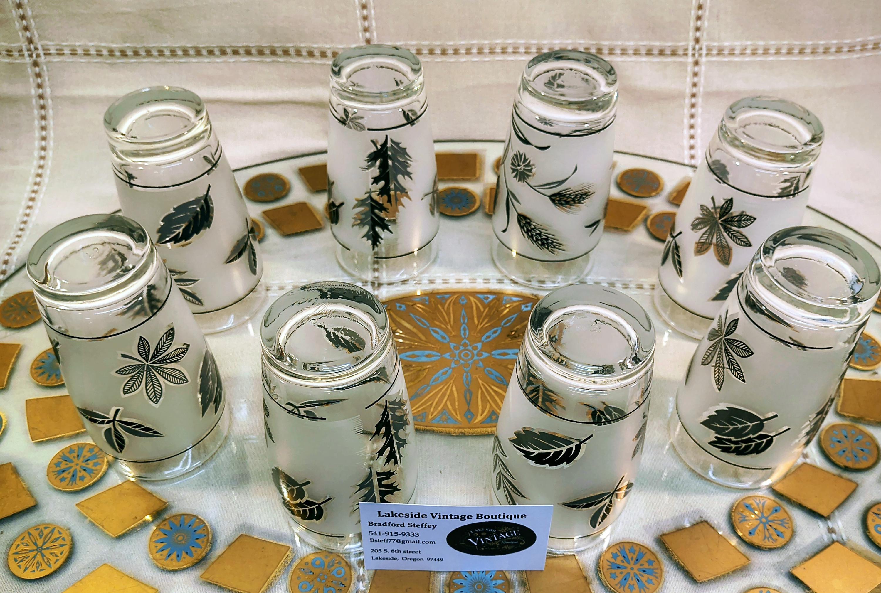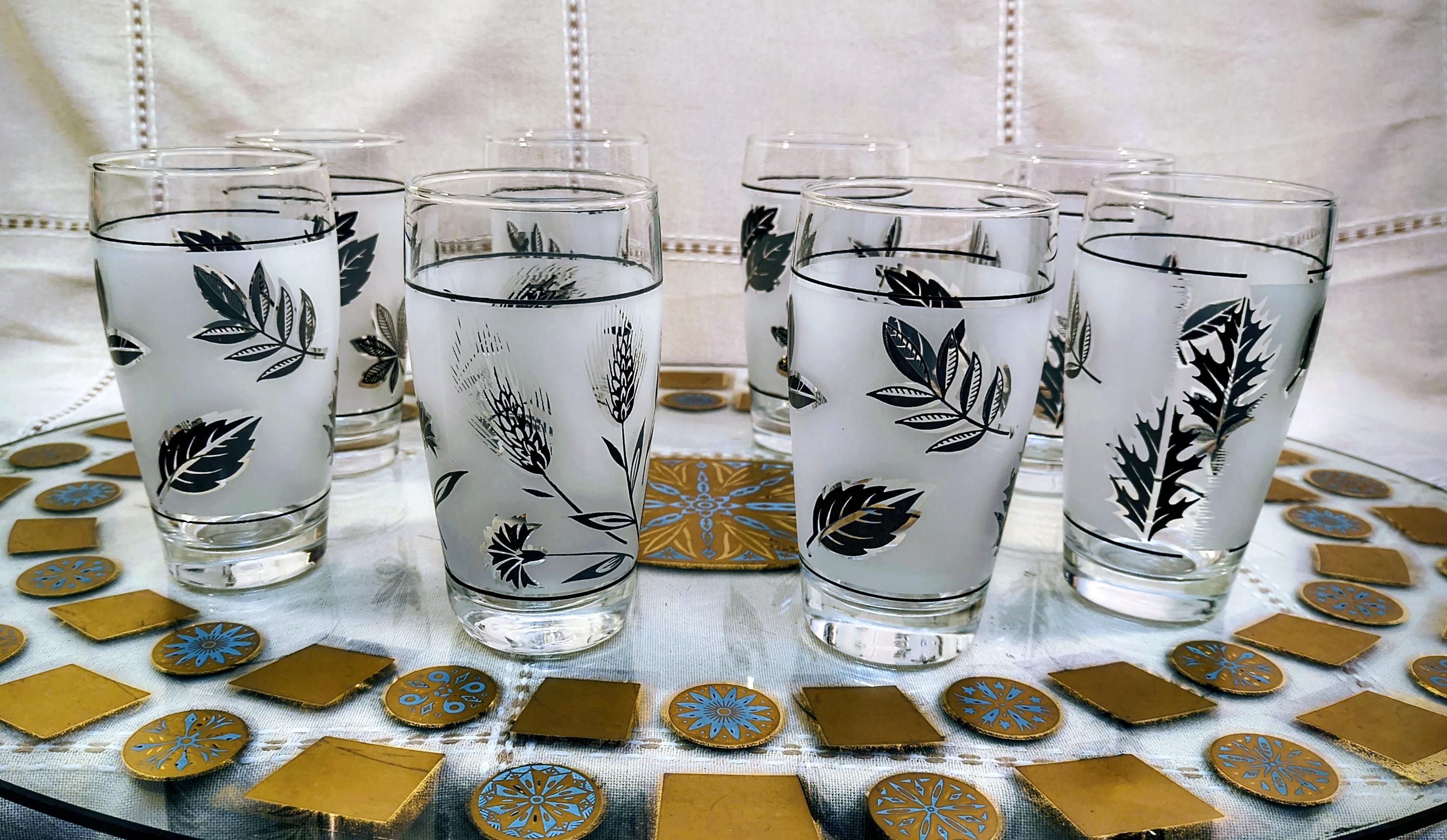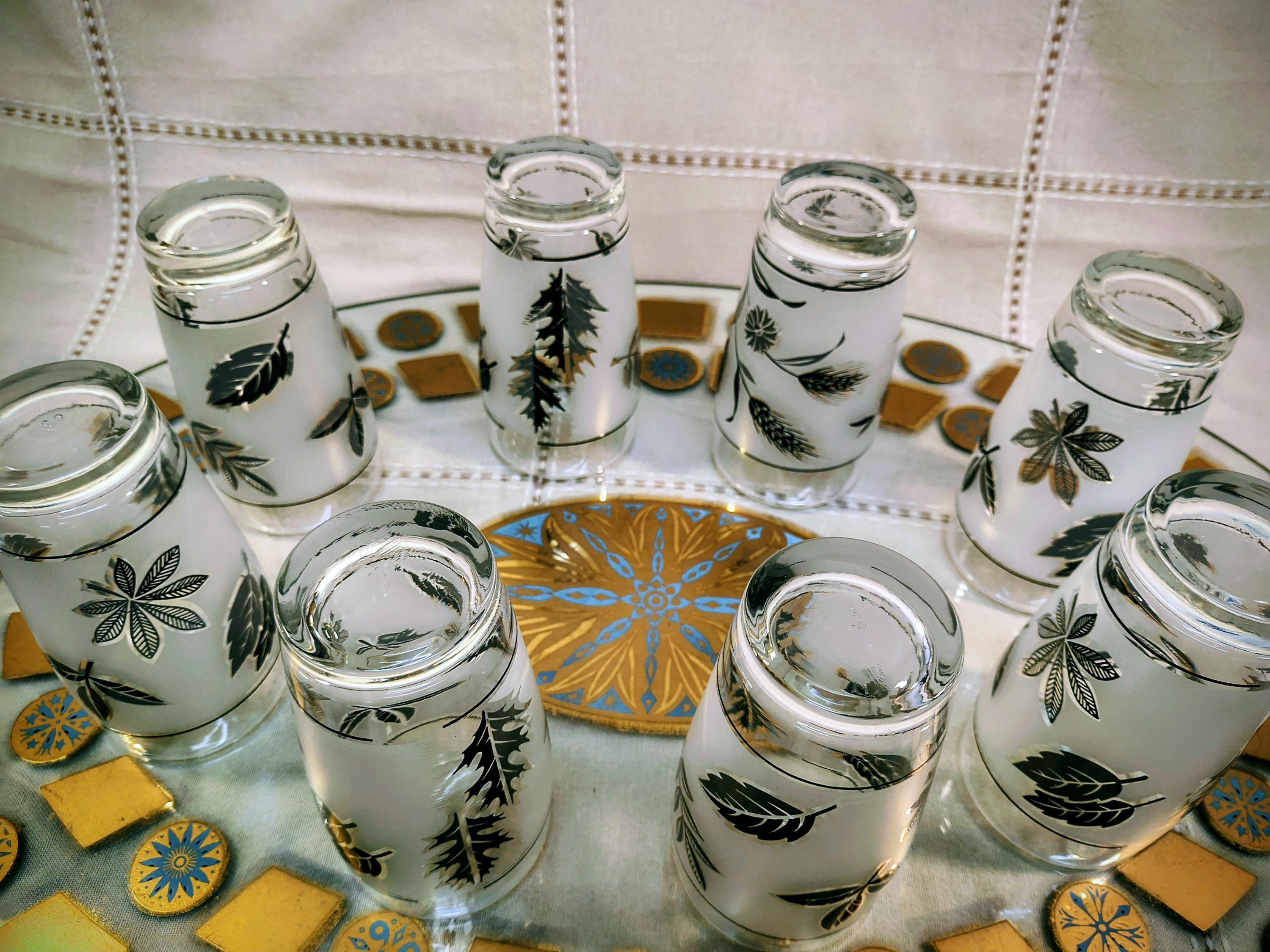 From a time vault, flawless condition full set of 8 this Libby frosted silver leaf set sets the mood perfectly for entertaining and holiday cheer.