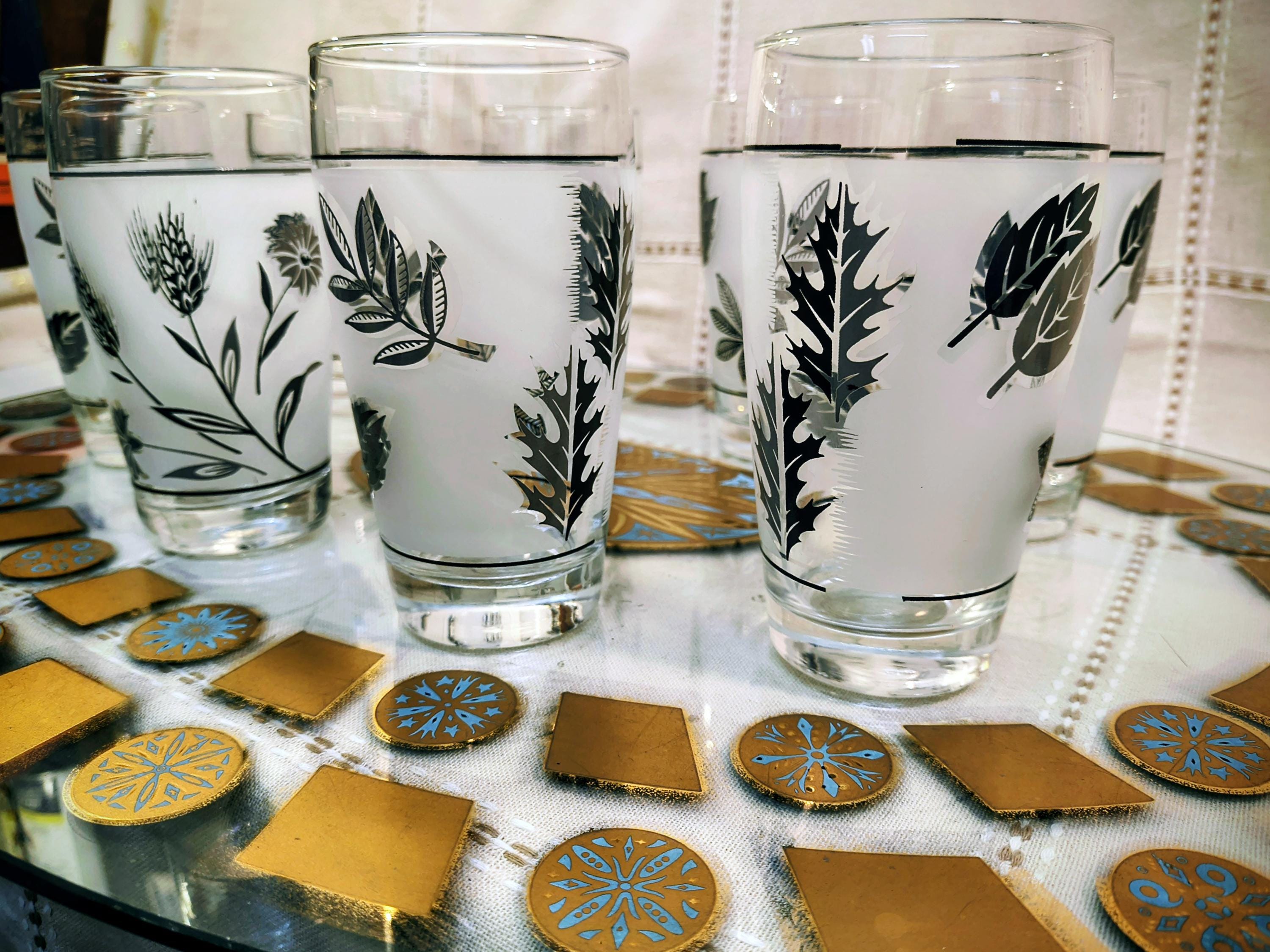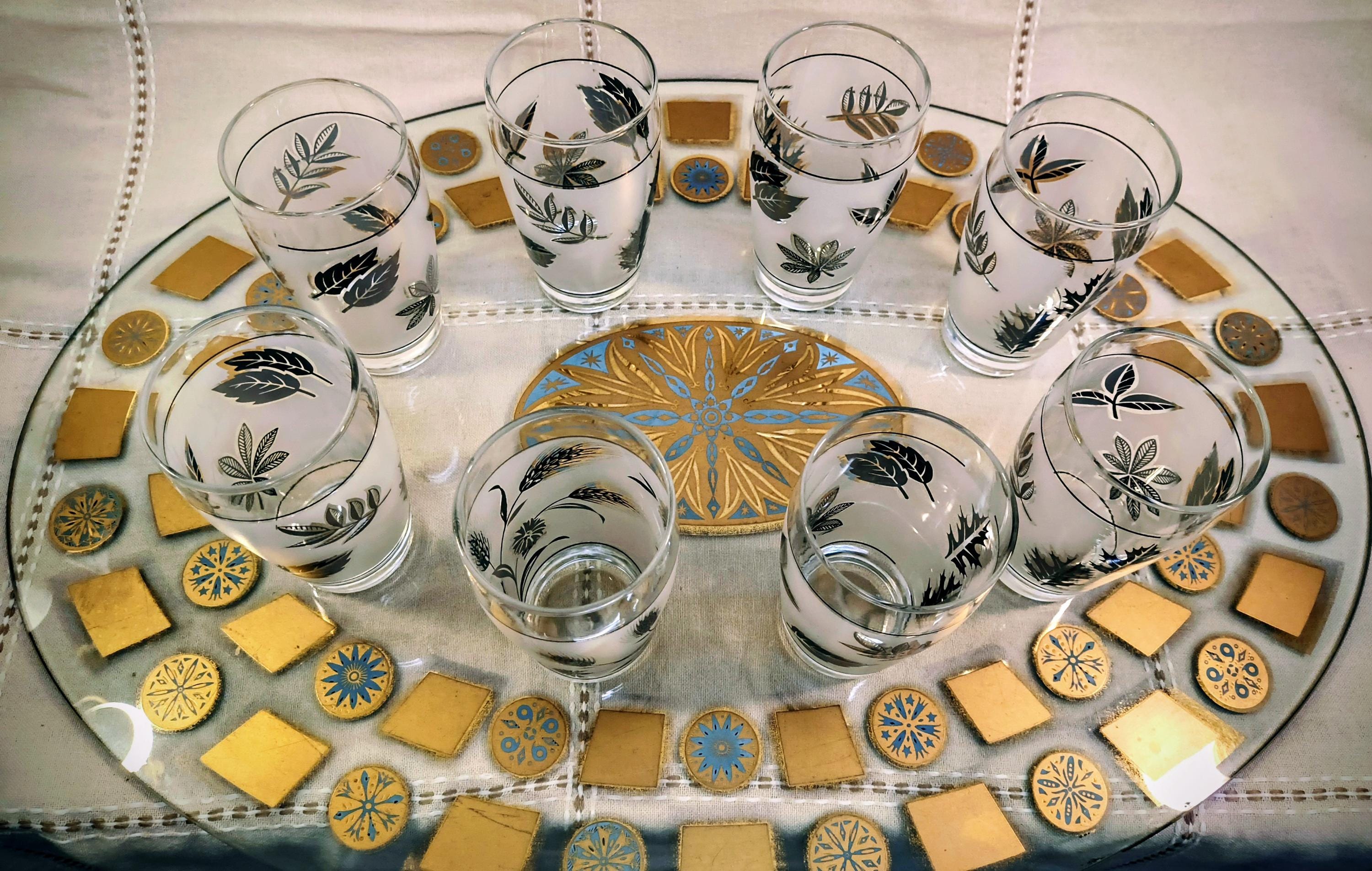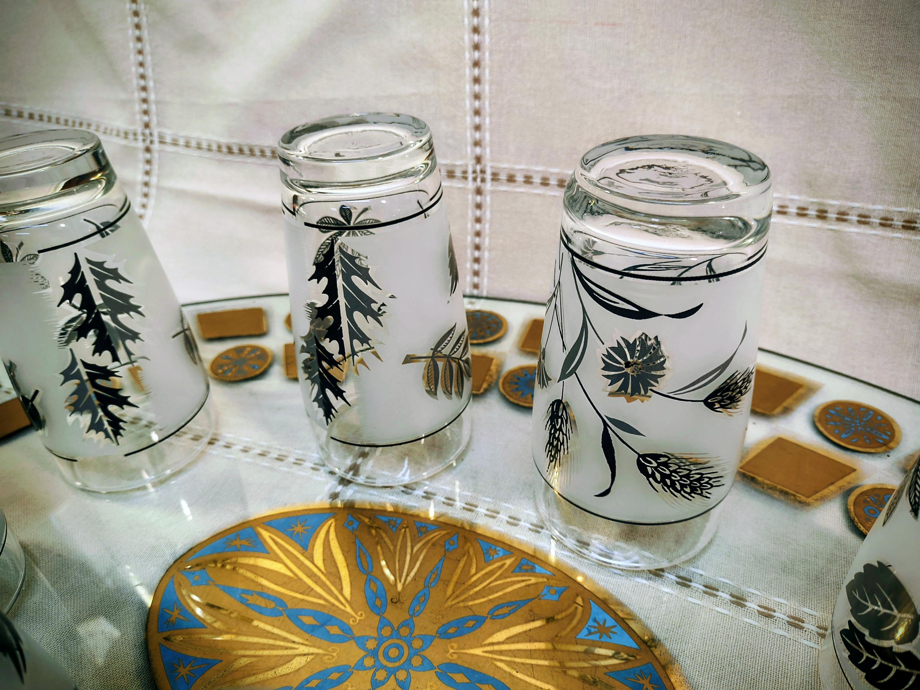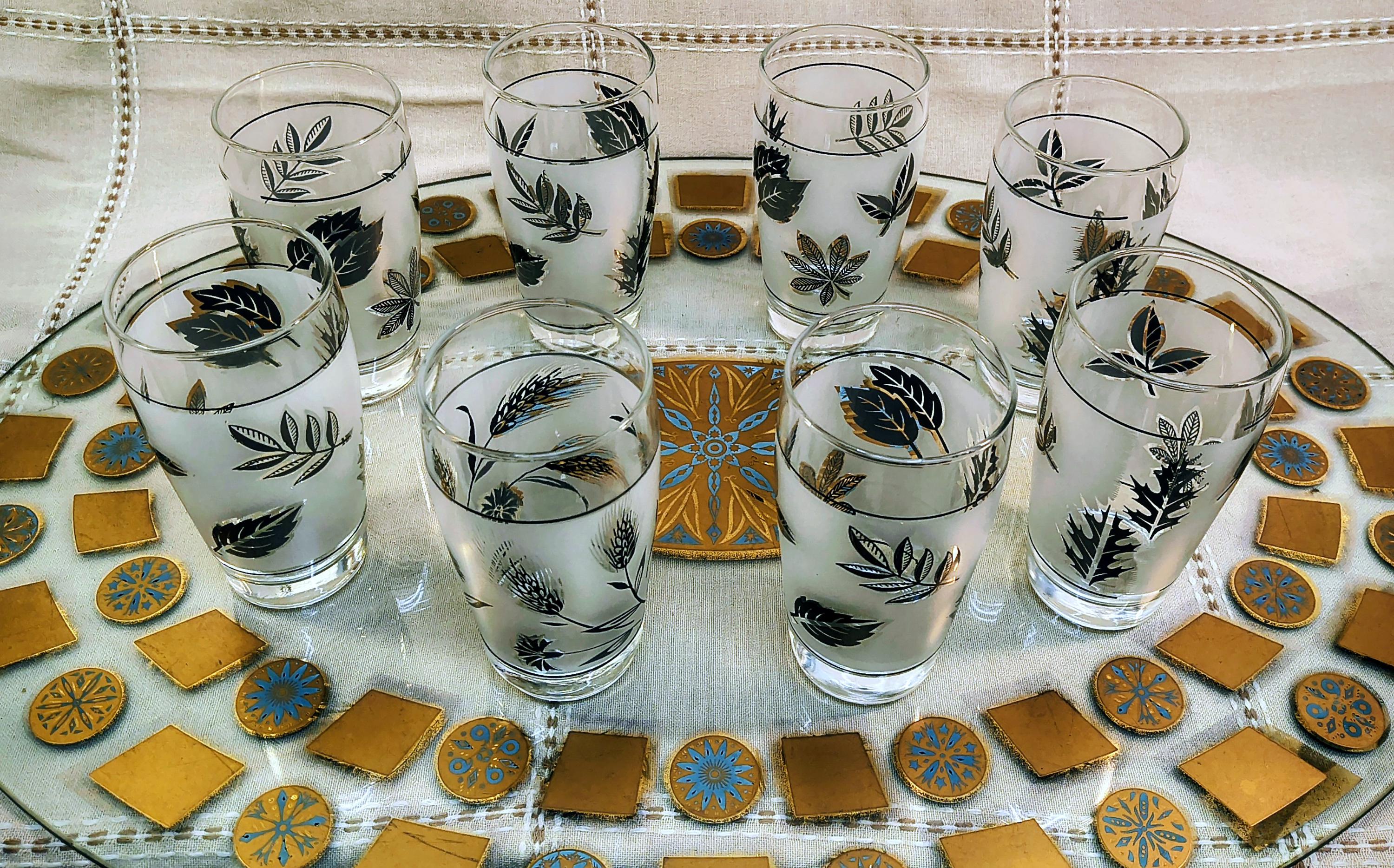 From a time vault, flawless condition full set of 8 this Libby frosted silver leaf set sets the mood perfectly for entertaining and holiday cheer.