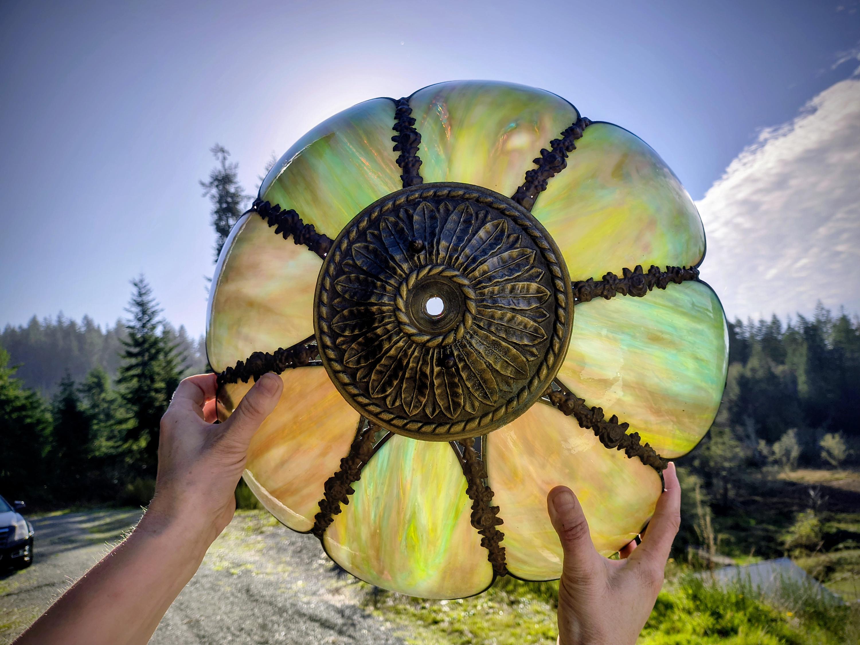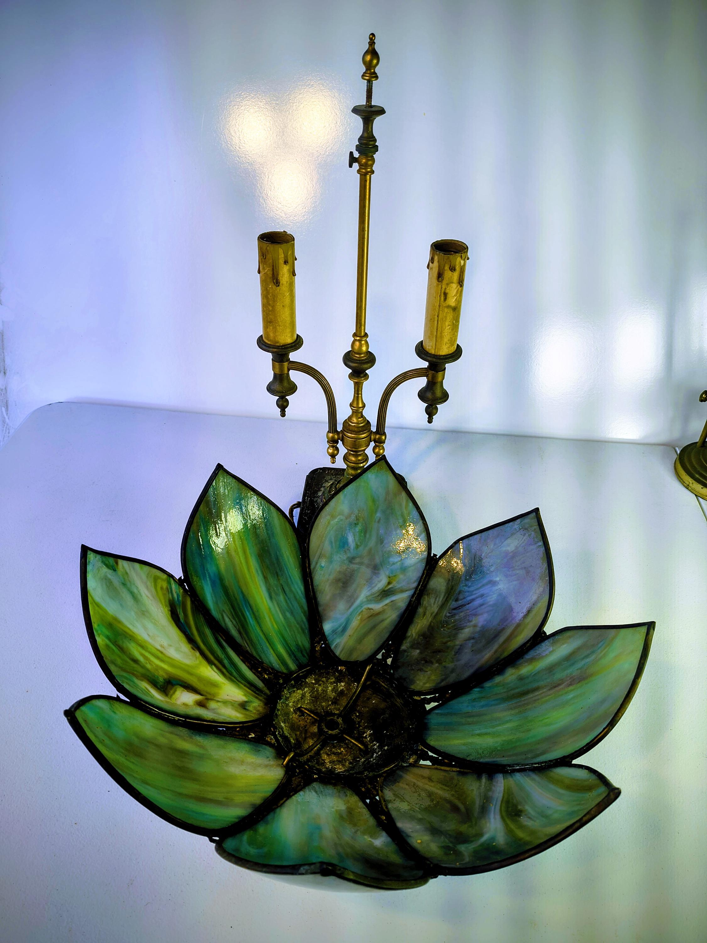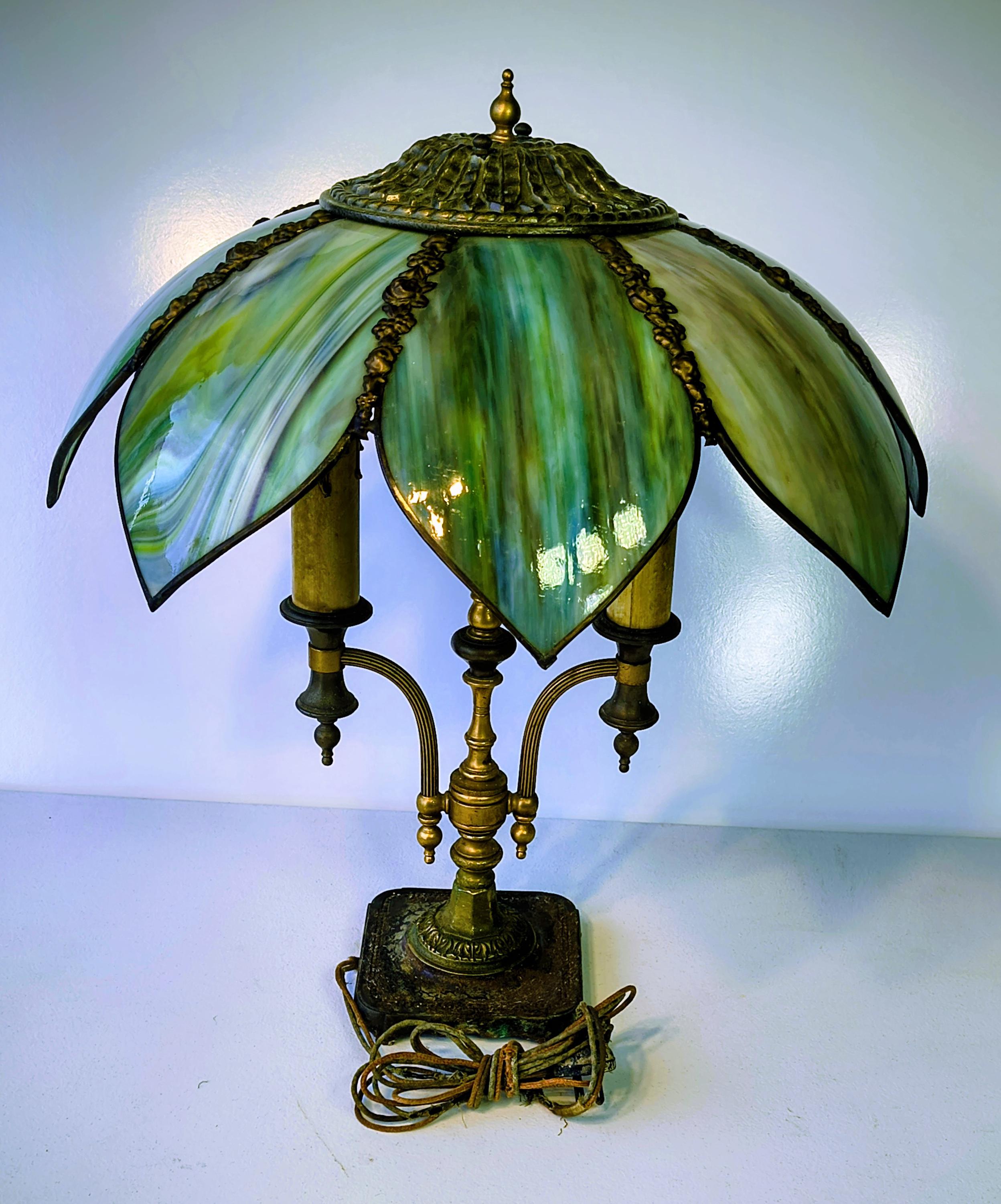 8 panel green slag lamp. Dual socket, solid brass base and fennial.