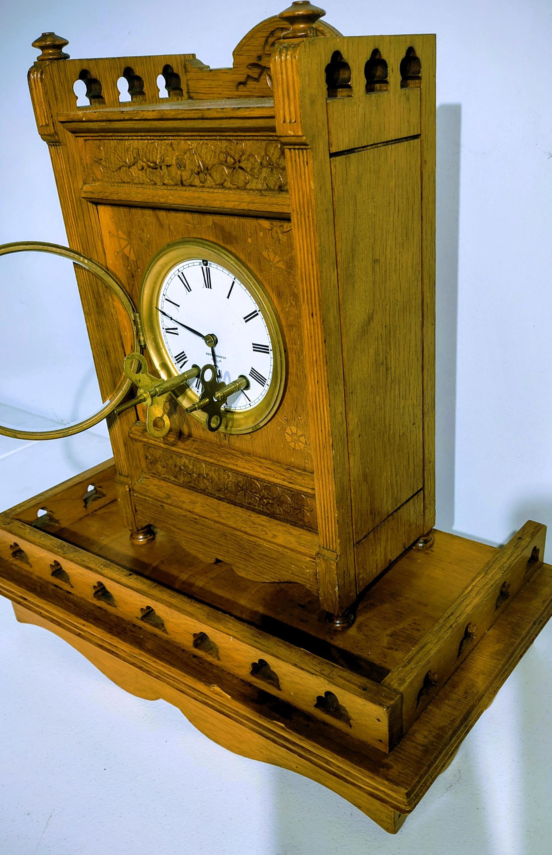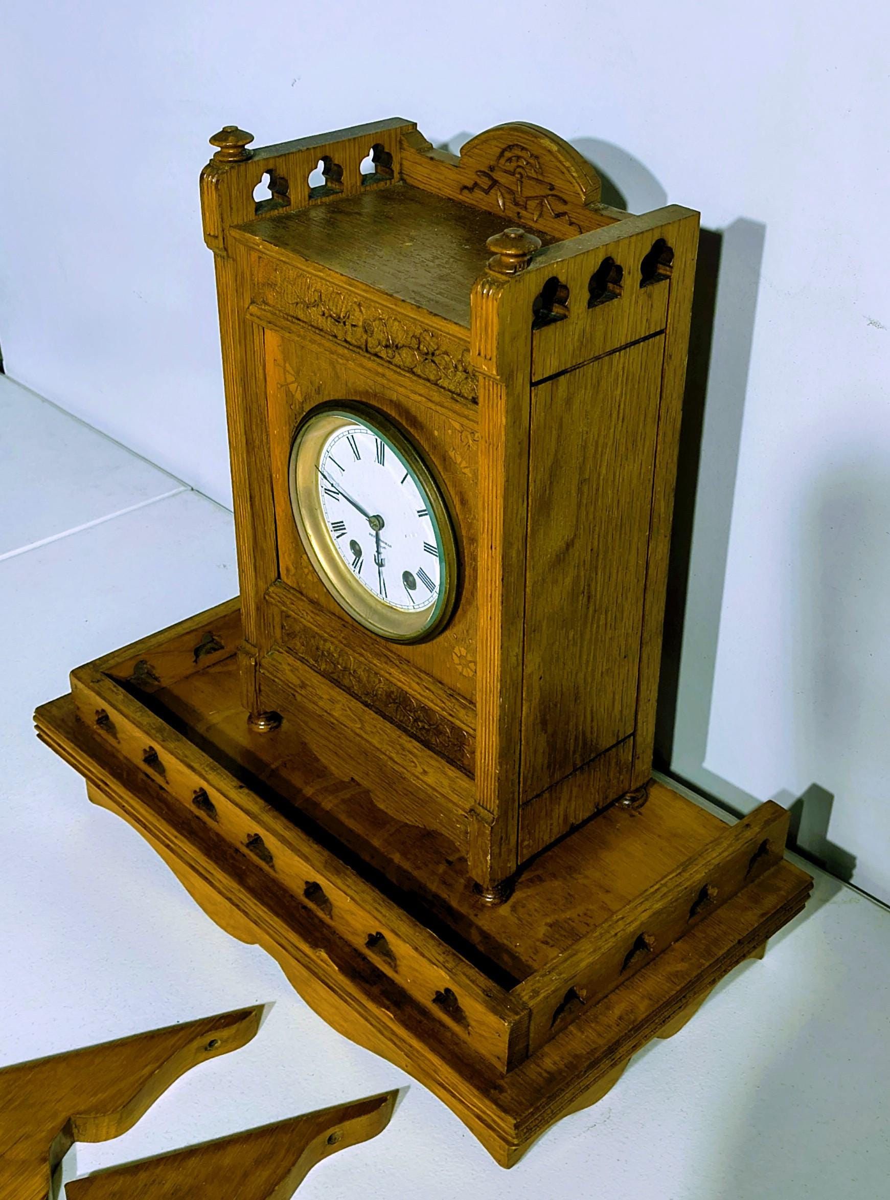 Victorian-era gingerbread-style piece, likely from the late 19th century (around 1880-1900), based on its ornate oak carvings, crenellated tower-like top, floral motifs, and overall Gothic Revival design. 8-day time-and-strike movement.